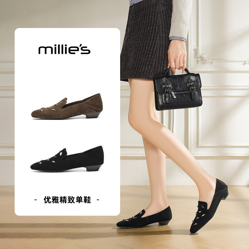 millies妙丽女鞋2025年秋季新款时尚百搭舒适真皮包头乐福鞋单鞋