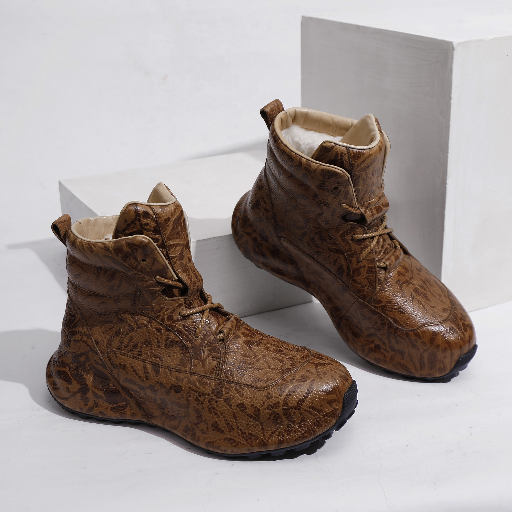 真野牛皮羊毛冬季保暖靴男女同款皮包底增高马丁靴复古真皮工装靴