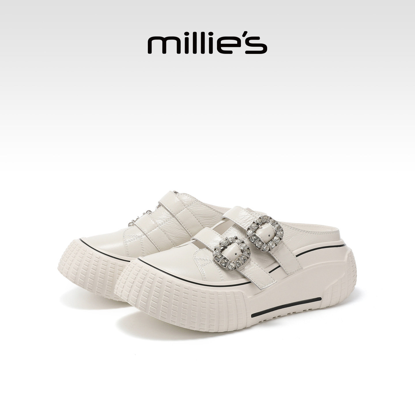 MILLIE'S/妙丽真皮包头半拖女白色水钻扣厚底软底凉拖鞋夏季新款