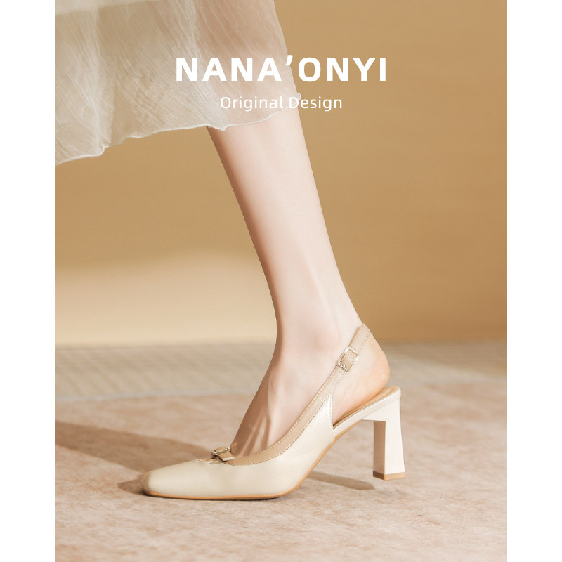 粗跟高跟鞋女2025新款夏季外穿方头配裙子一字带法式真皮包头凉鞋