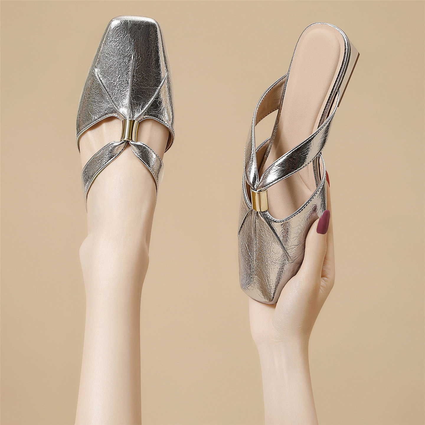 法式真皮包头半拖鞋女夏外穿2026新款银色软皮低跟凉拖鞋懒人穆勒