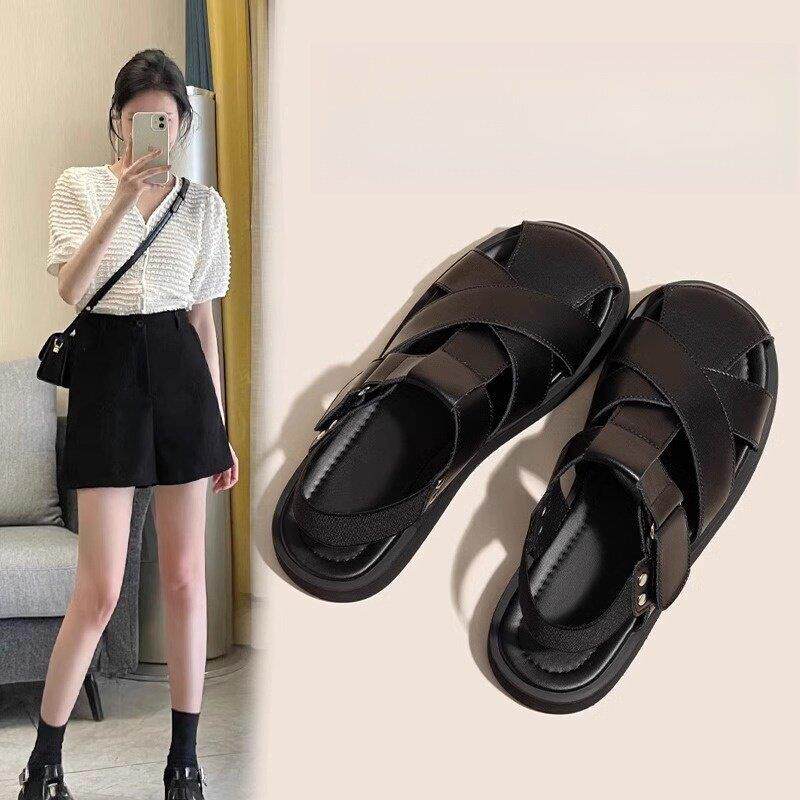 香港真皮包头罗马凉鞋女夏外穿2025新款厚底沙滩鞋编织镂空猪笼鞋