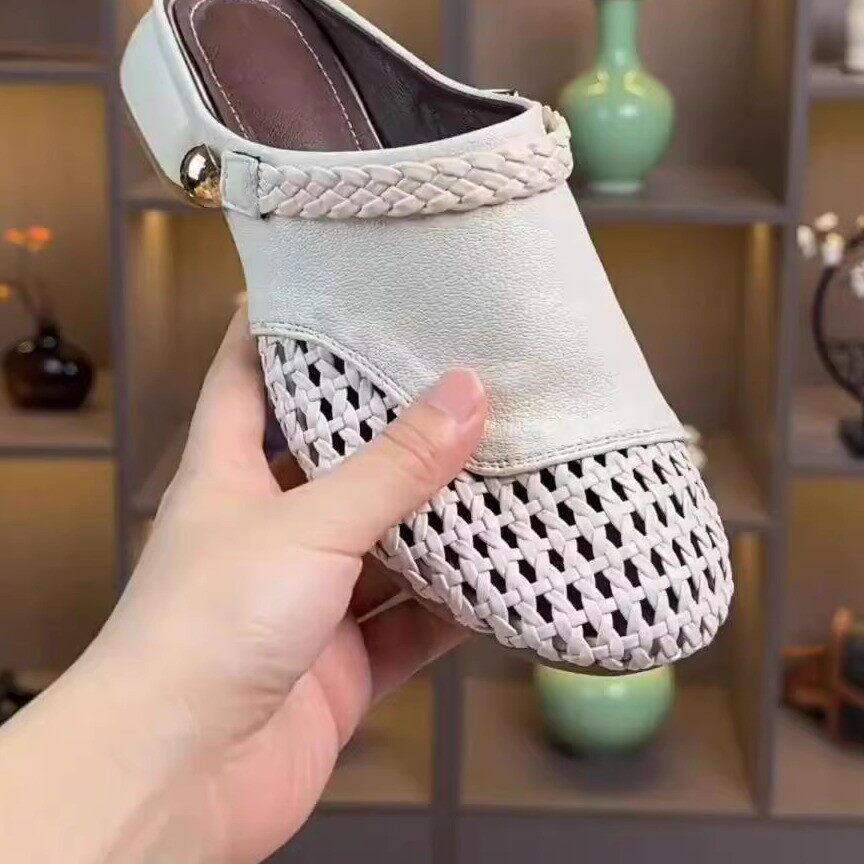 品牌清仓真皮包头镂空半拖鞋女2026夏季新款时尚编织软底两穿凉拖