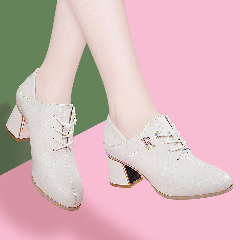 真皮包鞋女款2026年新款秋季中跟圆头高跟鞋粗跟百搭米色女士皮鞋
