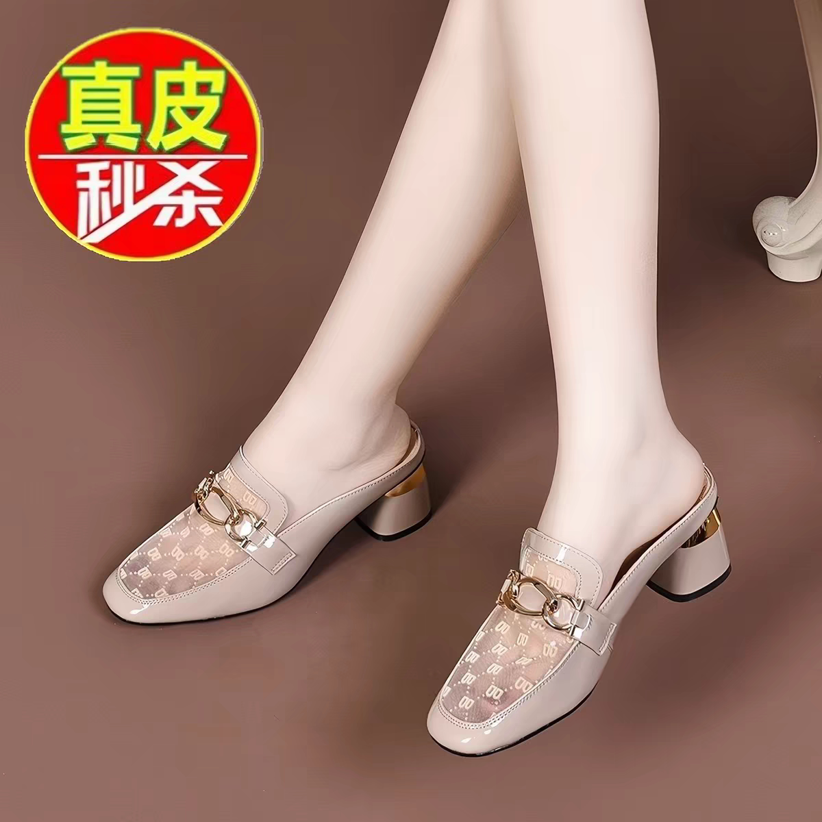 品牌断码清仓手工真皮包头半拖鞋女夏季外穿网纱镂空气质粗跟凉鞋