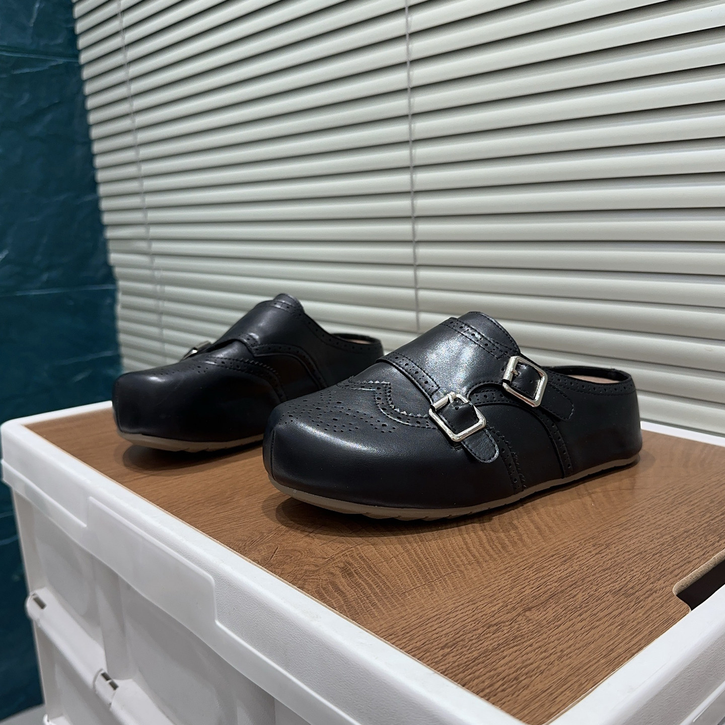 英伦风双扣带真皮包头半拖鞋女夏季外穿一脚蹬懒人浅色勃肯鞋黑色