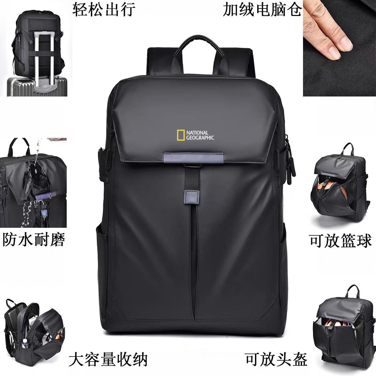 国家地理男士双肩包大容量背包通勤包电脑包商务公文包高初中生书包办公包 黑色-双层16英寸电脑-防水 可容纳16英寸电脑双层