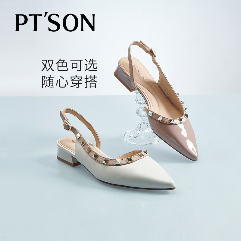 商场同款百田森真皮包头凉鞋女夏新铆钉拼色尖头时装半凉鞋