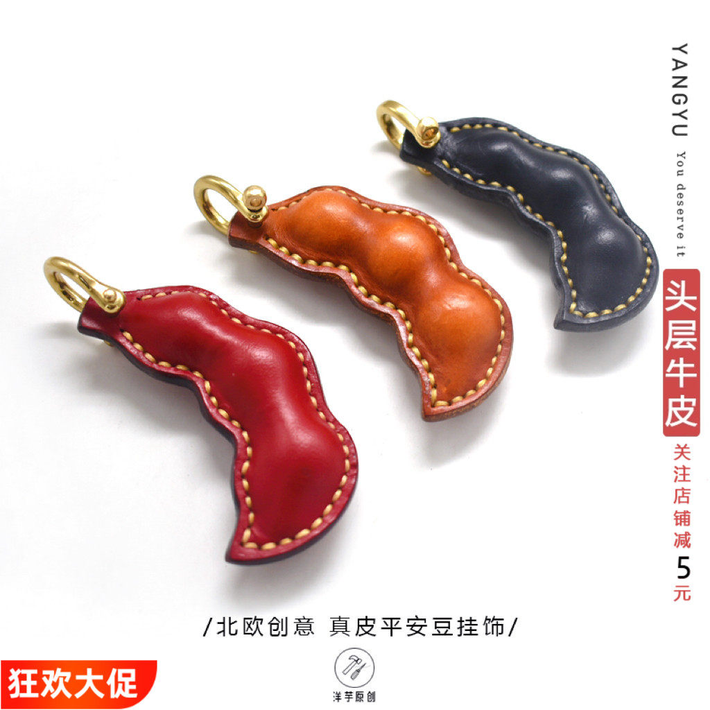 真皮『平安豆』双面车钥匙扣手工牛皮包挂饰汽车挂件手账书签礼物
