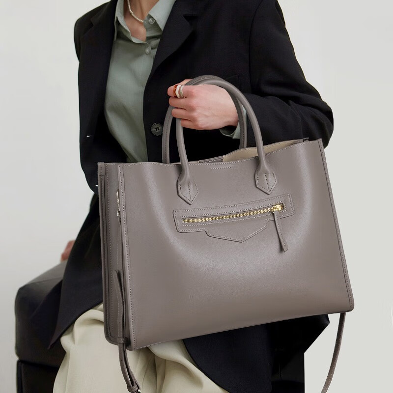 卡里普斯(CALYPSO)礼物牛皮包手提包2026女神节托特包女真皮高级感通勤电脑公文女包 灰色 小版-37厘米 可装14寸电脑
