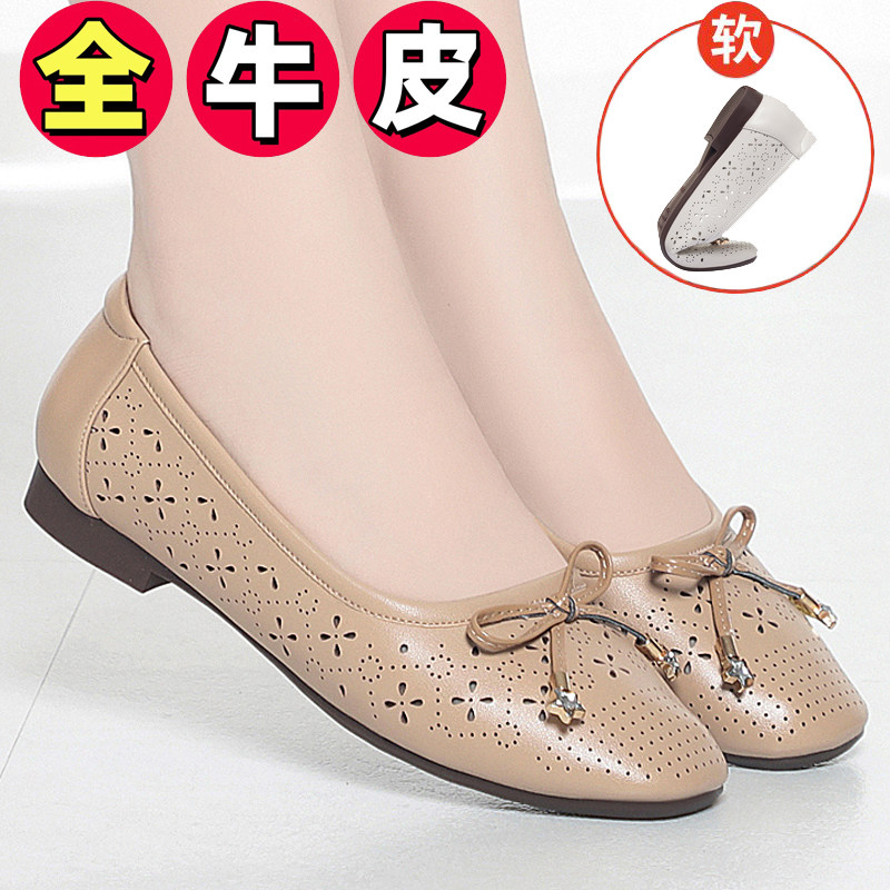 夏季新款真皮包头镂空透气女士凉鞋低跟平底舒适防滑中年妈妈皮鞋