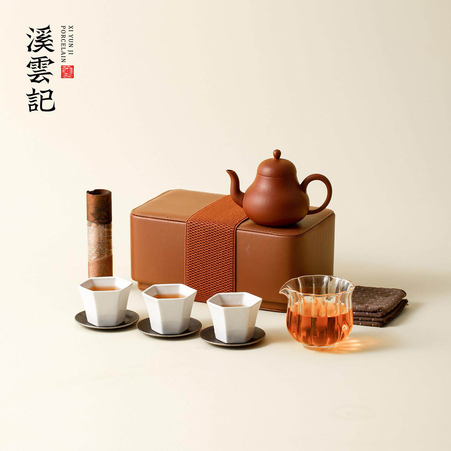 整套可携式旅行茶具紫砂壶皮包收纳茶杯一壶三杯户外高档快客杯礼