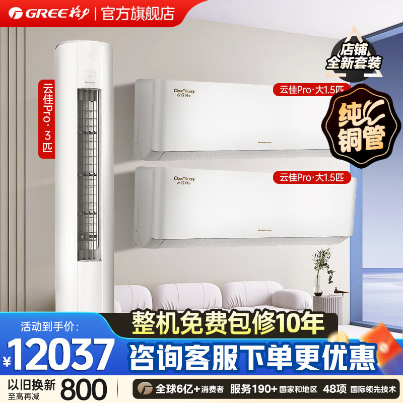格力(GREE)空调套装 云佳Pro新款系列 新一级能效 省电 智能WIFI 内外机双自清洁 变频冷暖 挂机柜机组合套装 两室一厅【云佳Pro1.5匹*2+3匹】