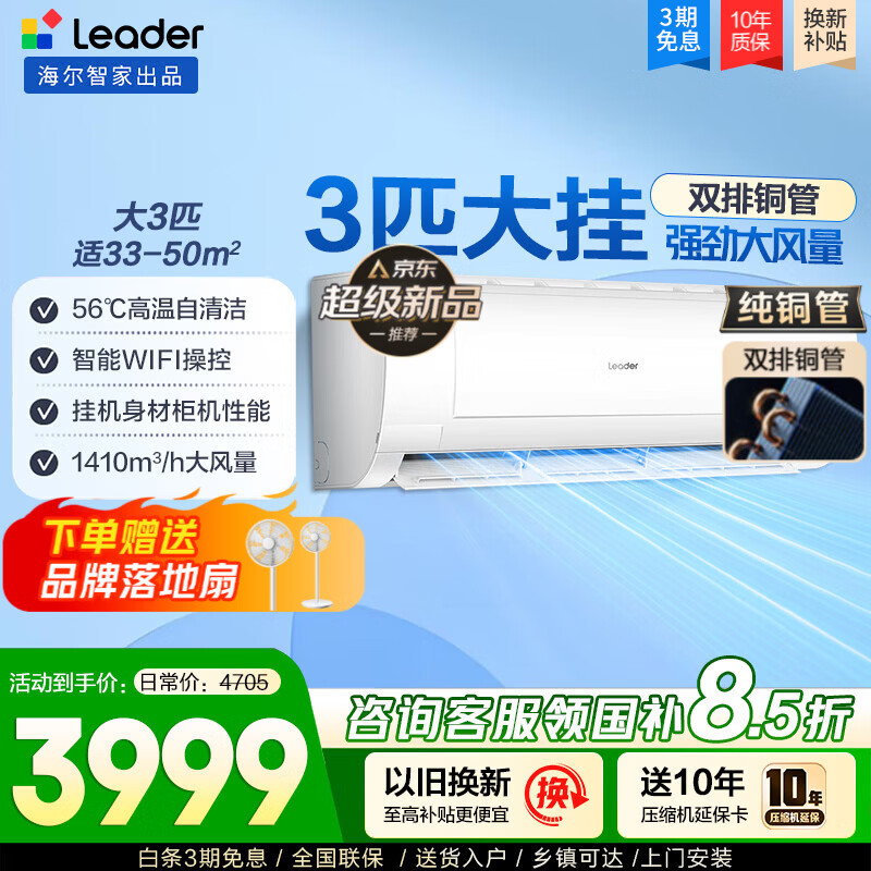 海尔空调出品统帅空调3匹P新一级能效变频空调挂机 壁挂式空调冷暖两用自清洁WiFi智控独立除湿 超省电 3匹 一级能效 变频冷暖大风量