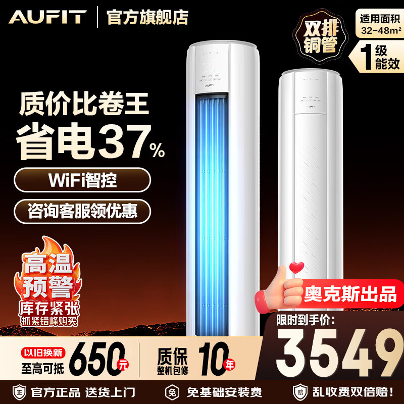 AUFIT空调奥克斯(AUX)出品大3匹柜机新一级国家补贴2匹变频冷暖省电客厅家用大风量智能立柜式以旧换新 3匹 一级能效防直吹双排铜管【wifi款】