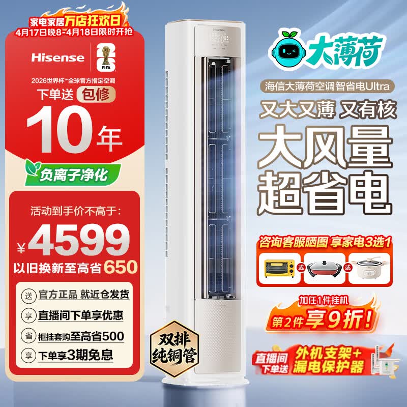 海信(Hisense)大薄荷空调智省电ultra 大3匹双排纯铜管 AI省电35% 世界杯定制空调柜机 客厅立式72LW/E370Pro-X1 智省电 超一级 大3匹 【风量天花板】咨询客服享底价