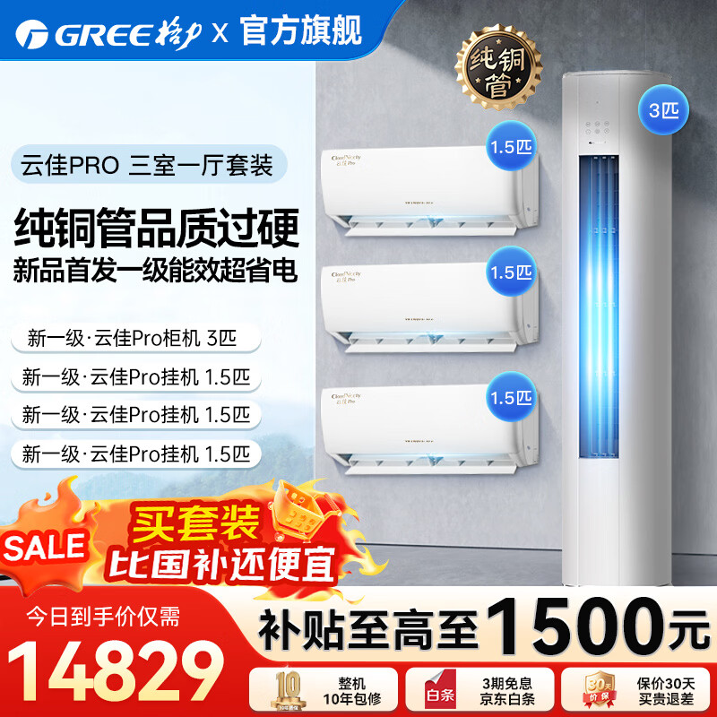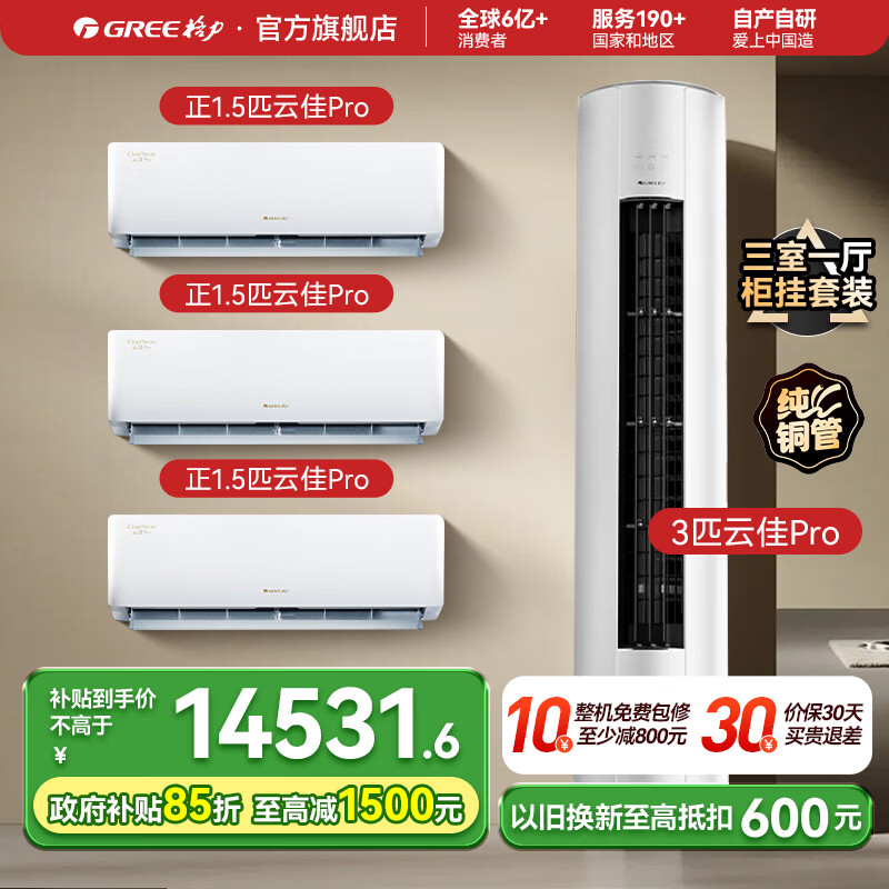 格力(GREE)空调套装新一级能效高温自清洁家用节能省电变频组合挂机柜机云佳PRO套装 【云佳PRO新上市】三室一厅1.5匹*3+3匹*1