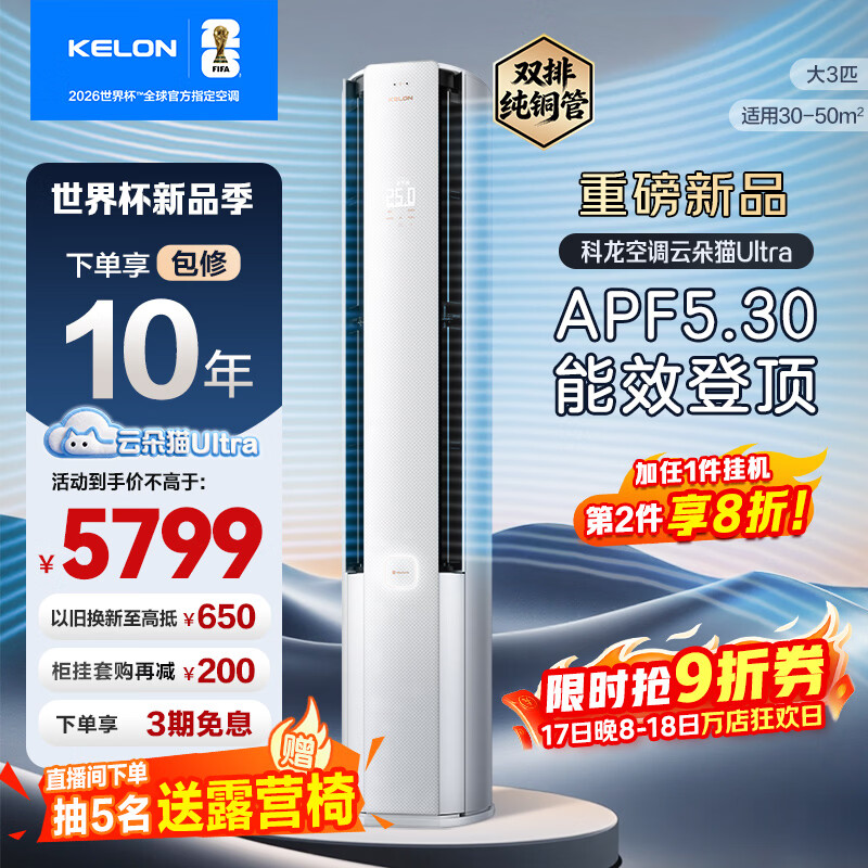 科龙(KELON)科龙空调大3匹柜机 海信出品 云朵猫Ultra 世界杯定制 智能语音新一级变频 客厅立柜式 国家补贴 云朵猫 大3匹 一级能效 72QS1ultra 换新补贴