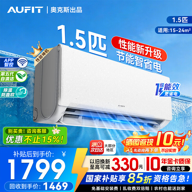 AUFIT空调奥克斯(AUX)出品空调挂机1.5匹/1匹/2匹家用新一级变频冷暖省电WIFI以旧换新国家补贴15% 特省电 MAX 大1.5匹 一级能效防直吹自清洁-智控款