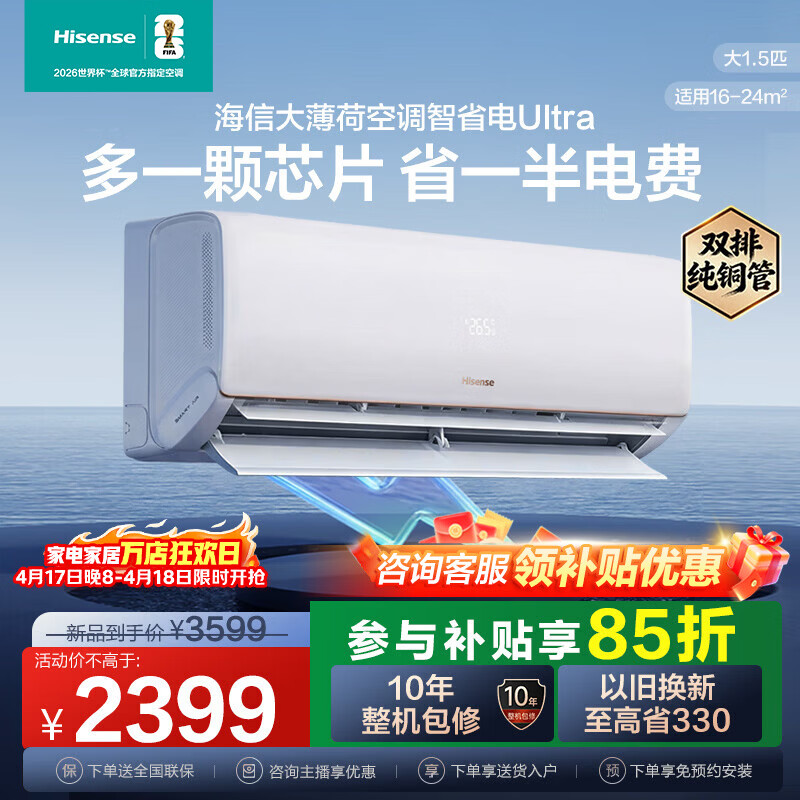 海信(Hisense)大薄荷空调挂机 大1.5匹 智省电Ultra 超一级能效 舒适双导板 变频S架构 以旧换新 智省电 大1.5匹 一级能效大薄荷ultra+
