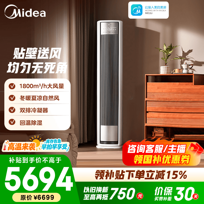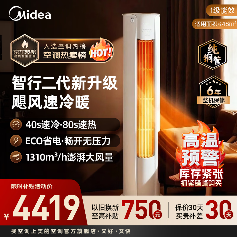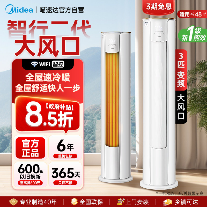 美的空调柜机 智行 新一级能效 变频冷暖 家用客厅空调立式 国家补贴空调 空调官方旗舰店 智行二代 大3匹 一级能效四向送风