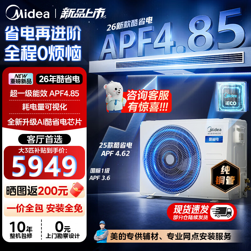 美的中央空调酷省电大3匹一拖一变频冷暖家用超一级能效商用一价全免包安装客厅风管机 酷省电 大3匹 【升级26款】(30-49㎡)