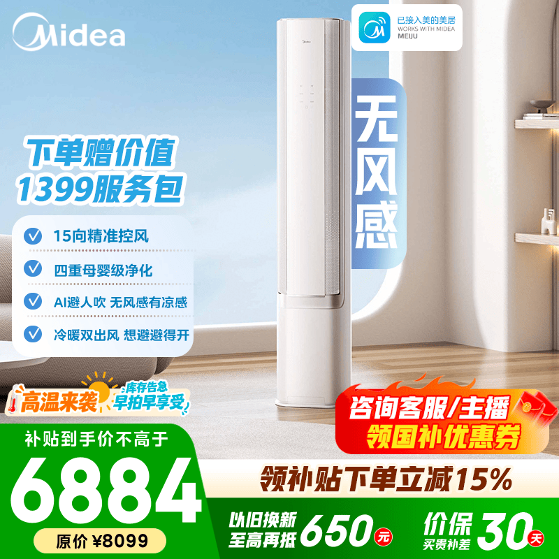美的空调 2匹/3匹 全面风 新一级能效变频冷暖 贴壁送风 防直吹 客厅立式柜机 国家补贴 以旧换新 全面风 大3匹 双排冷凝 贴壁送风
