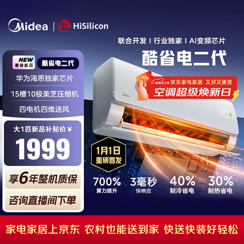 美的空调挂机 1.5匹酷省电二代 大1匹酷省电Pro 国家补贴15% 一级能效变频冷暖智能 以旧换新旗舰店 酷省电二代 大1匹 海思AI变频芯片