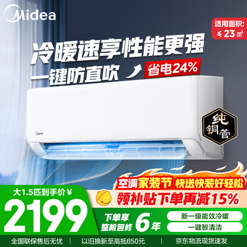 美的空调挂机静新风1.5匹p新一级能效变频冷暖挂机官方旗舰店正品