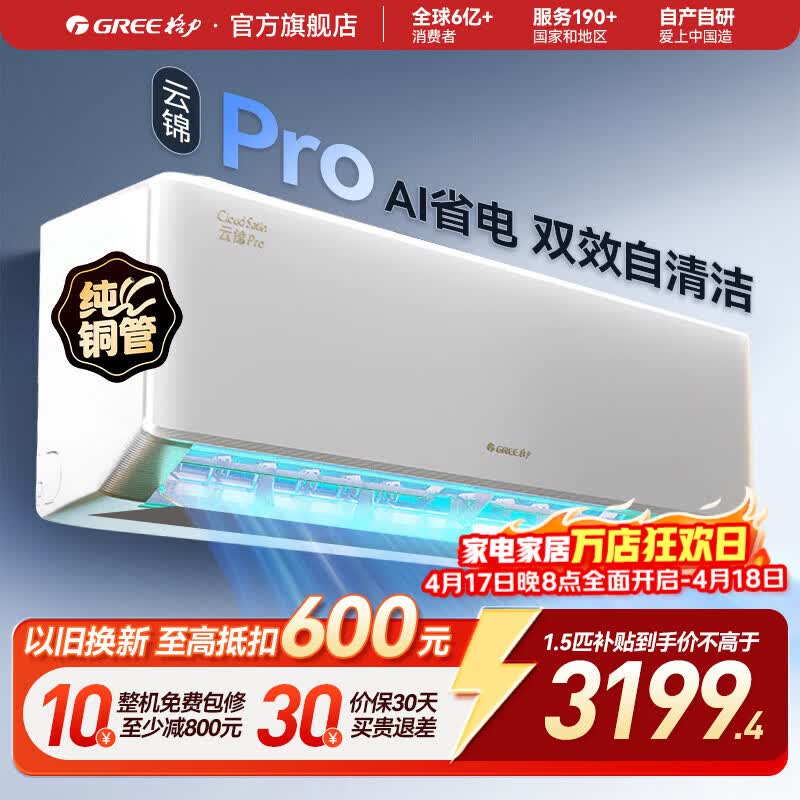 格力(GREE)空调云锦Pro/云锦三代挂机超一级新能效Ai节能省电变频冷暖自清洁壁挂式卧室家用 云锦Pro新款上市 1.5匹 AI智能省电 风量升级