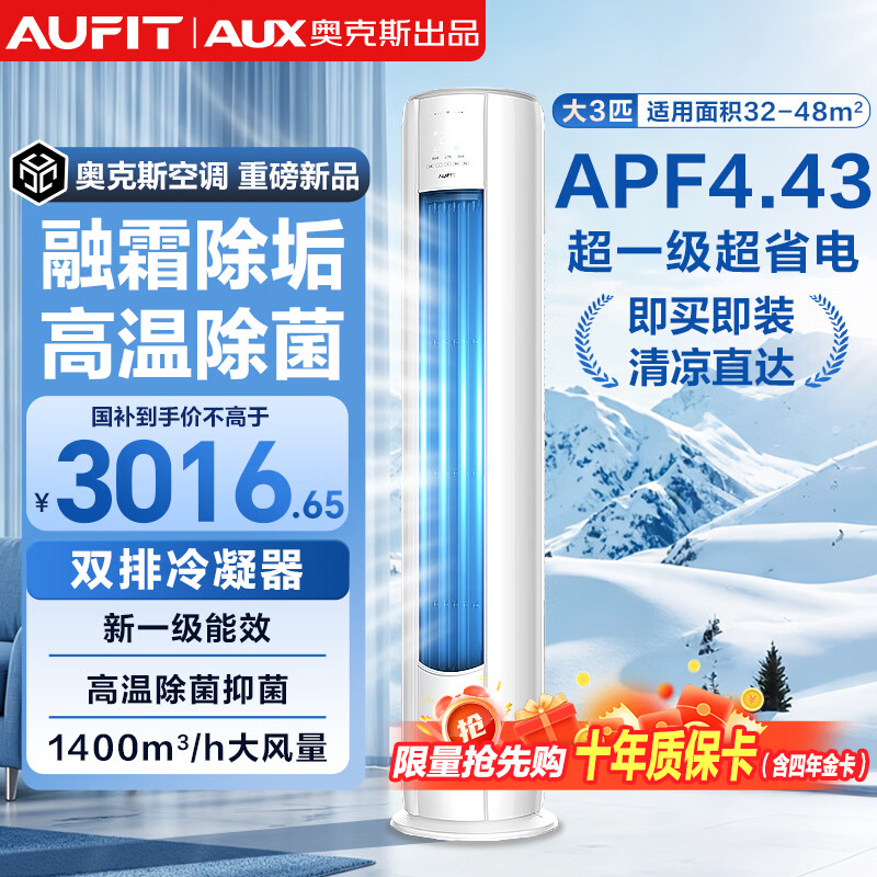 AUFIT空调奥克斯AUX出品大3匹2匹立式柜机 新一级能效省电家用变频冷暖自清洁客厅立柜机圆柱式以旧换新 特省电 3匹 柜机一级能效自清洁防直吹【WIFI款】