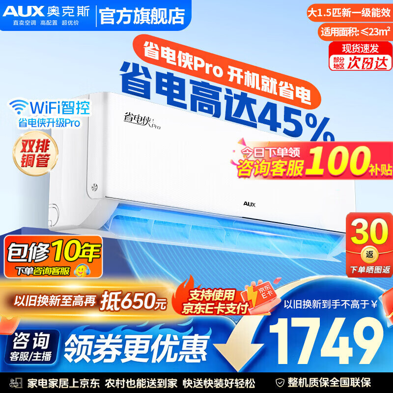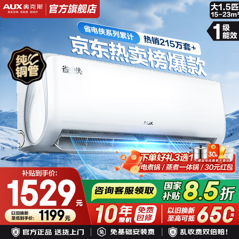奥克斯(AUX)空调1.5匹 挂机新1级能效独立除湿节能省电一键舒风壁挂式卧室冷暖自清洁以旧换新 省电侠Pro 大1.5匹 新一级能效省电45% 25新款