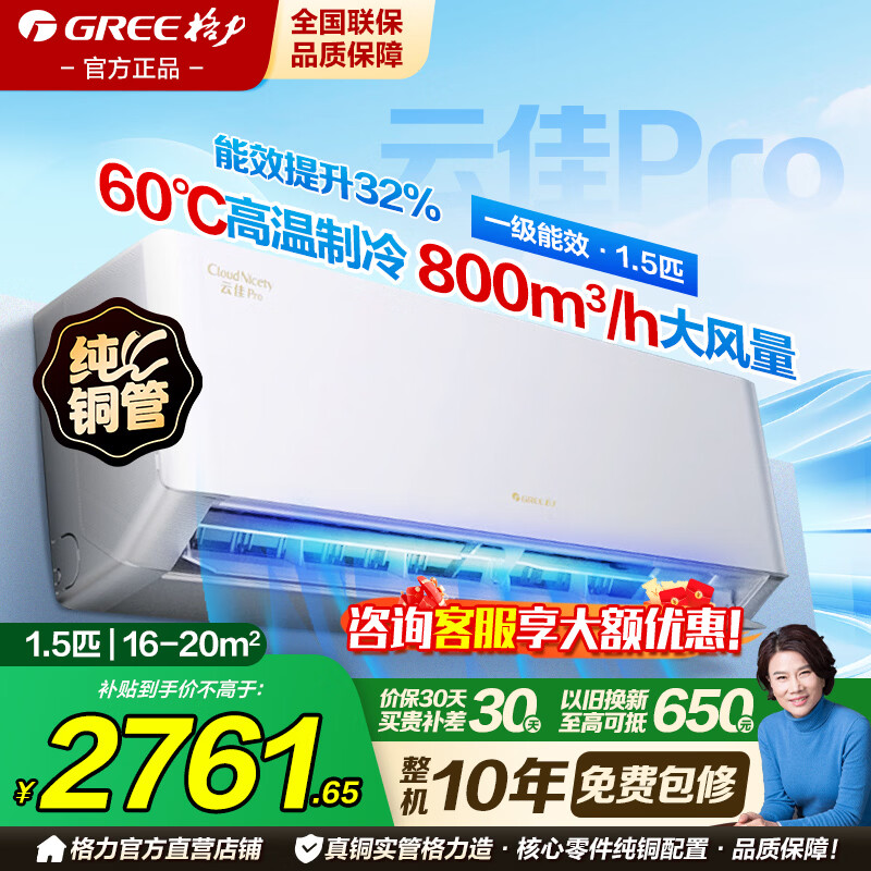格力空调1.5匹一级能效国家补贴云佳pro挂机变频冷暖以旧换新省电节能卧室家用卧室上门安装官方正品 1.5匹 云佳pro【纯铜管+冷酷外机更强劲】 一级能效