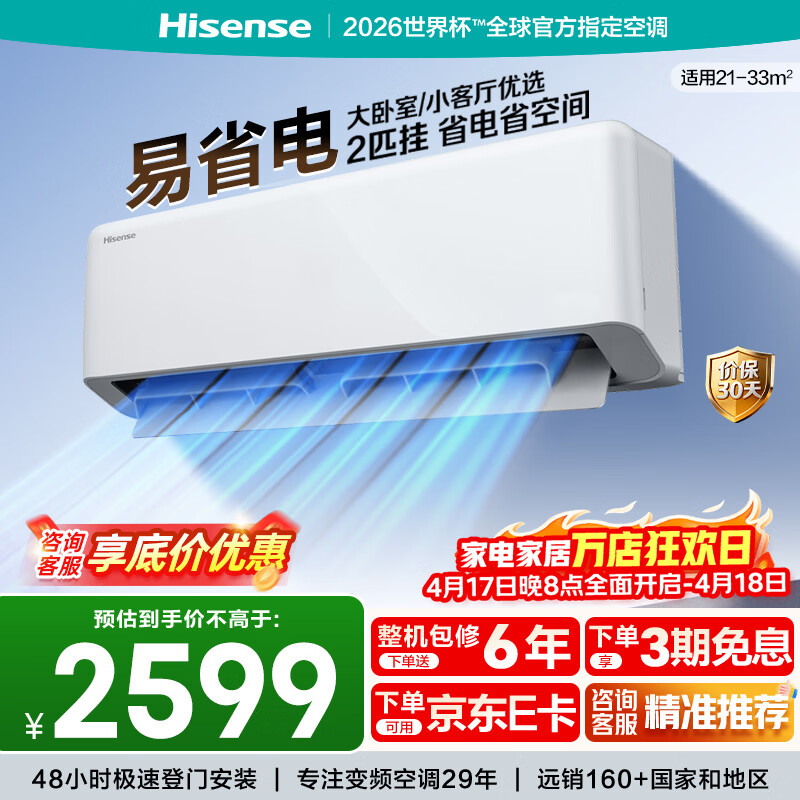 海信(Hisense)空调 大2匹 易省电E280 AI省电 速冷热仿真自然风 新一级能效 国家补贴15% 卧室客厅挂式 空调挂机 KFR-50GW/E280-X1