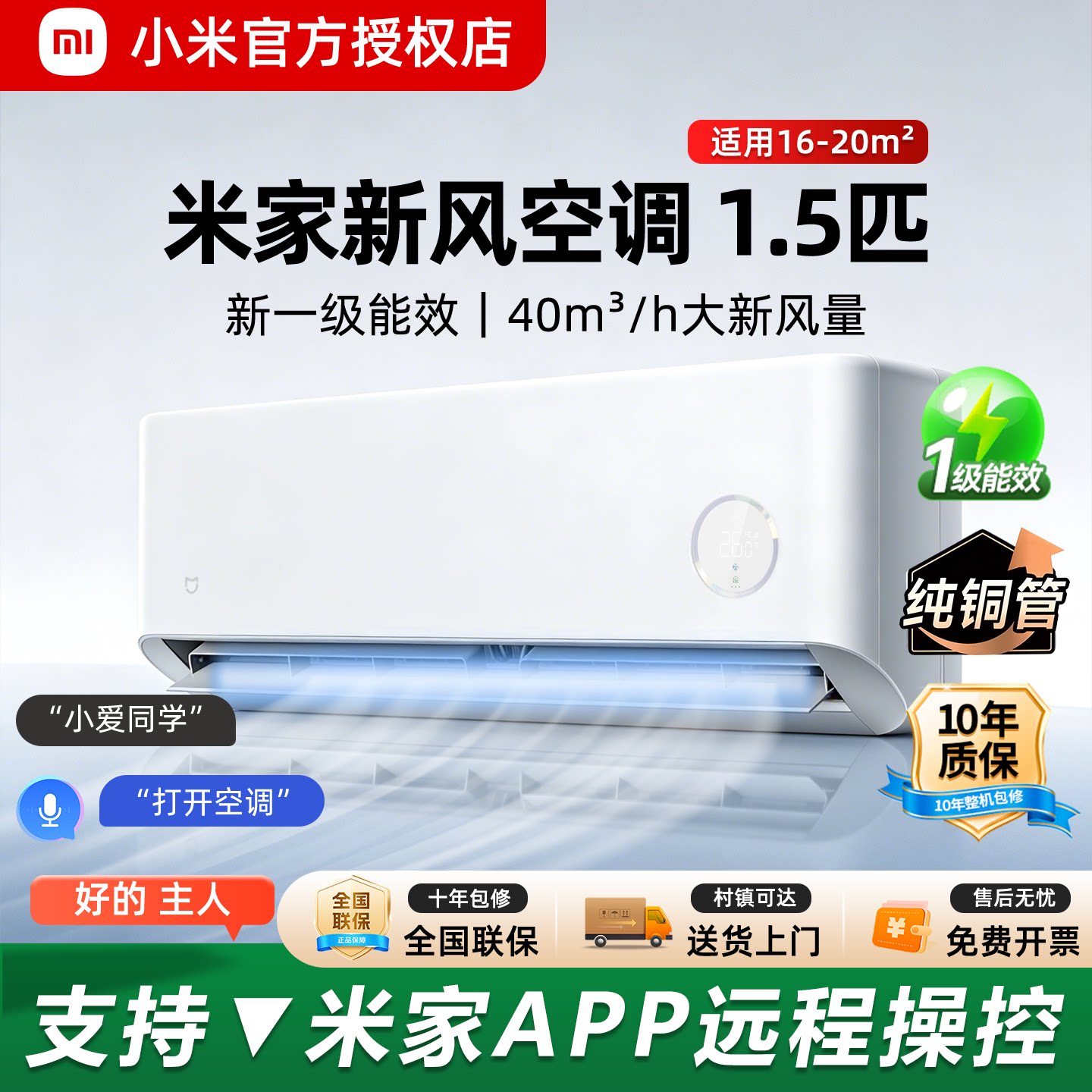 小米新风空调1.5匹 新一级能效 变频冷暖 壁挂式自清洁2P智能互联