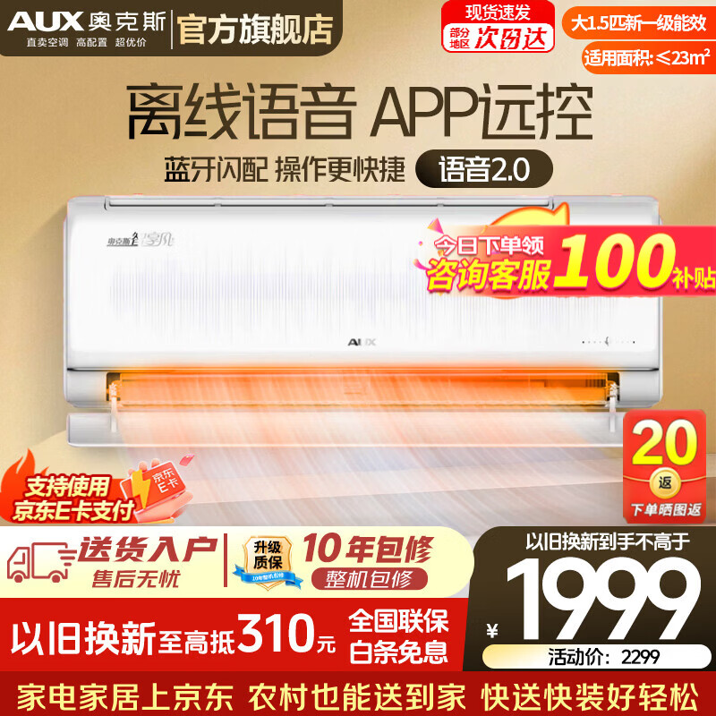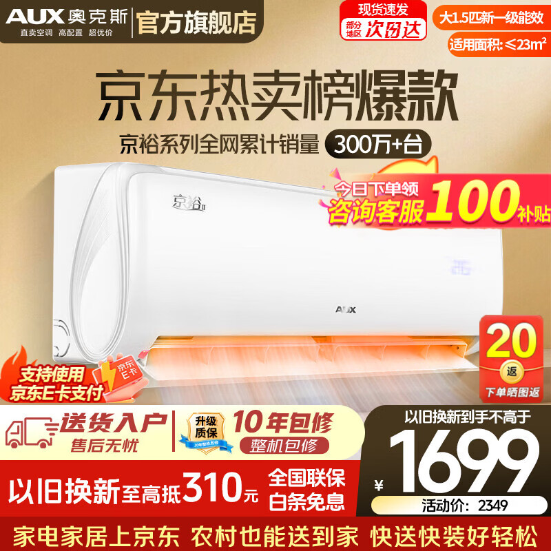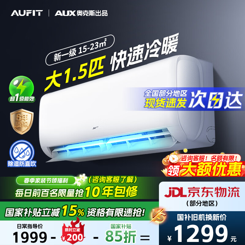 奥克斯(AUX)空调1.5匹挂机 自清洁 变频速冷暖 低噪节能 以旧换新 壁挂式家用节能 京裕 大1.5匹 一级能效京裕Ⅱ 经典再升级