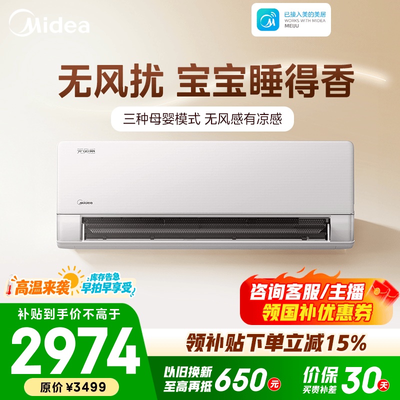美的空调 大1匹/1.5匹 云朵系列 无风感 母婴级净护 节能省电 家用卧室冷暖挂机 国家补贴 以旧换新 无风感二代 大1.5匹 母婴级