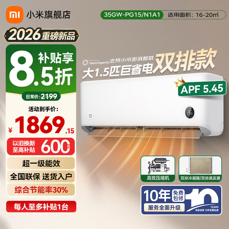 小米(MI)米家空调 巨省电 大1.5匹 一级能效 变频冷暖制热 自清洁壁挂式空调挂机 2026款 35GW-PG15/N1A1 大1.5匹 一级能效 双排铜管