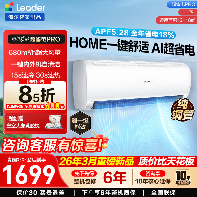 海尔(Haier)出品统帅空调挂机1匹/1.5匹新一级能效变频冷暖壁挂式家用空调自清洁防直吹家电补贴15% 超省电pro 1匹 超一级能效一键AI省电26LXCA