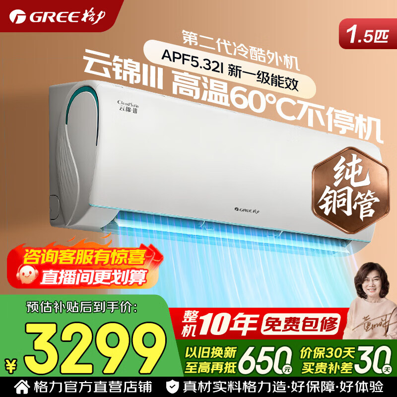 格力空调 云锦三代 1.5匹 新一级能效 变频冷暖 纯铜管 家用节能省电 壁挂式空调挂机 家电国家补贴 1.5匹 云锦三代 性价比爆款 纯铜管【 冷酷外机】