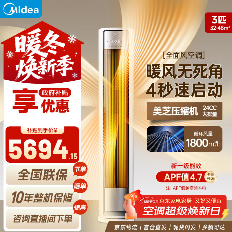 美的空调立式柜机全面风 风尊二代 3匹 新一级能效变频冷暖 客厅智能 电量查询 以旧换新 全面风 新一级能效柜机 大3匹 25年重磅新款