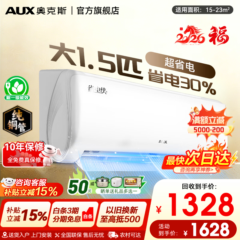奥克斯空调挂机1.5匹省电侠Pro新品一级能效变频冷暖省电节能除菌自清洁壁挂式以旧换新家电空调补贴15% 大1.5匹 省电侠一级变频