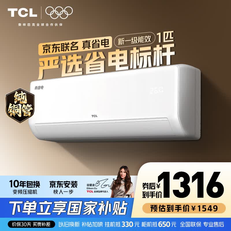 TCL空调1.5/2匹真省电 纯铜管 空调挂机 一级能效 变频冷暖 壁挂式卧室挂机 以旧换新 1匹 KFR-26G/JD21+B1