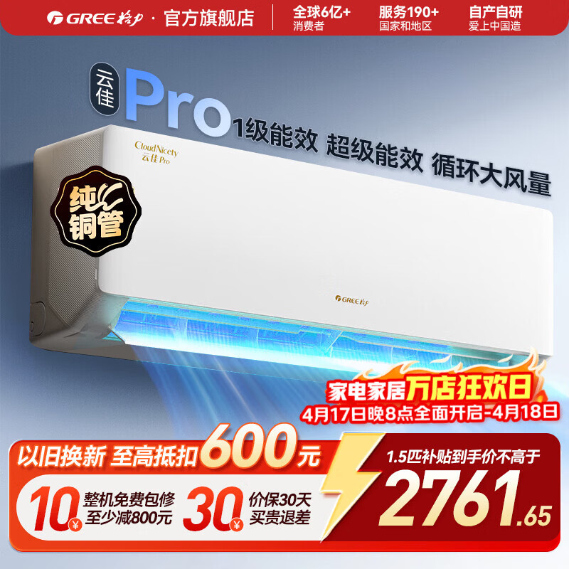 格力(GREE)空调 云佳Pro【超级省电】 新一级能效 变频冷暖 自清洁 壁挂式 卧室空调挂机 国家补贴 云佳Pro 冷酷外机 1.5匹 一级能效 新款上市