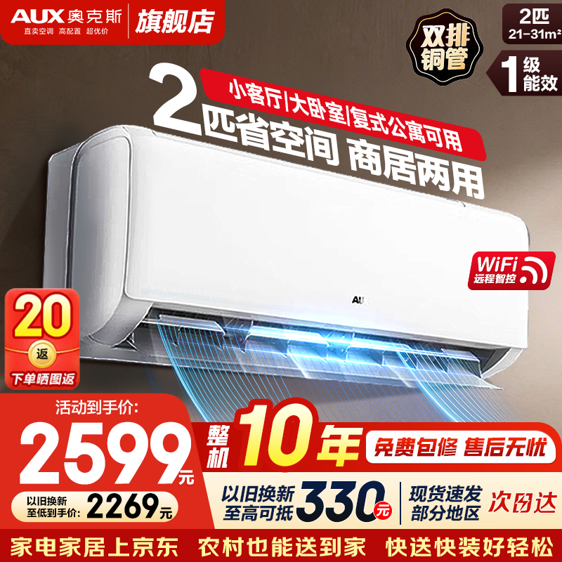 奥克斯(AUX)空调挂机省电侠Pro 大2匹新一级能效变频冷暖壁挂式客厅商居两用自清洁 空间劲省 铜管空调 2匹一级能效 省电侠 超大风量