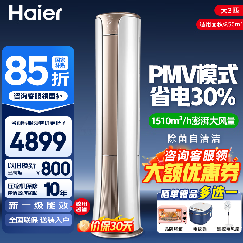 海尔(Haier)空调大3匹柜机 净省电小红花新一级能效全直流变频冷暖大风口家用自清洁WiFi智控客厅圆柱立式空调 大3匹 云畅 一级能效一键PMV 省电30%