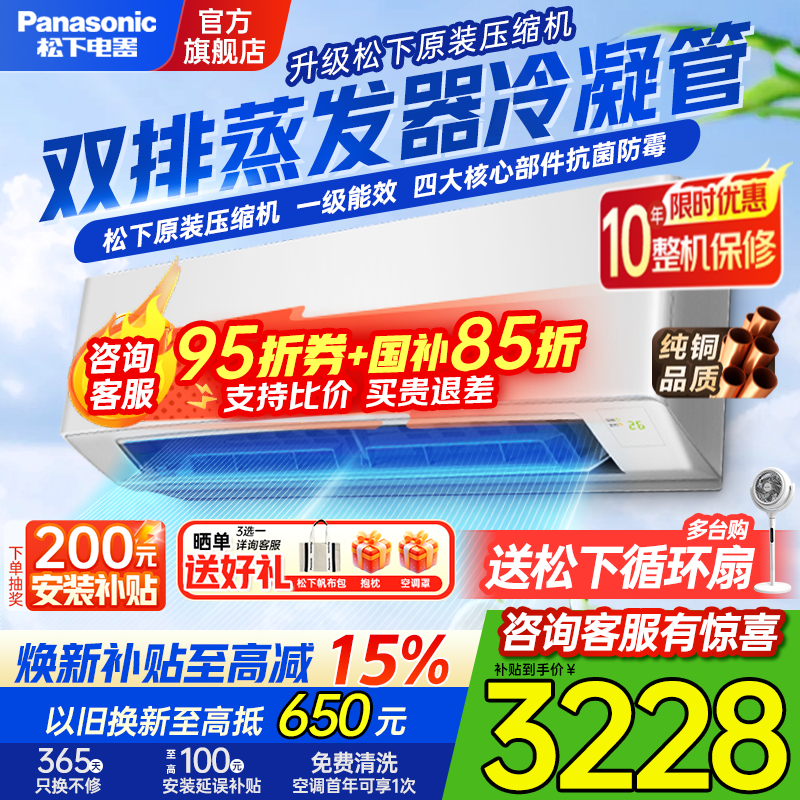 松下(Panasonic)1匹/1.5匹空调家用一级能效空调直流变频冷暖节能 双排纯铜管壁挂式空调挂机省电以旧换新 E1系列 1.5匹 一级能效【E13KQ10】