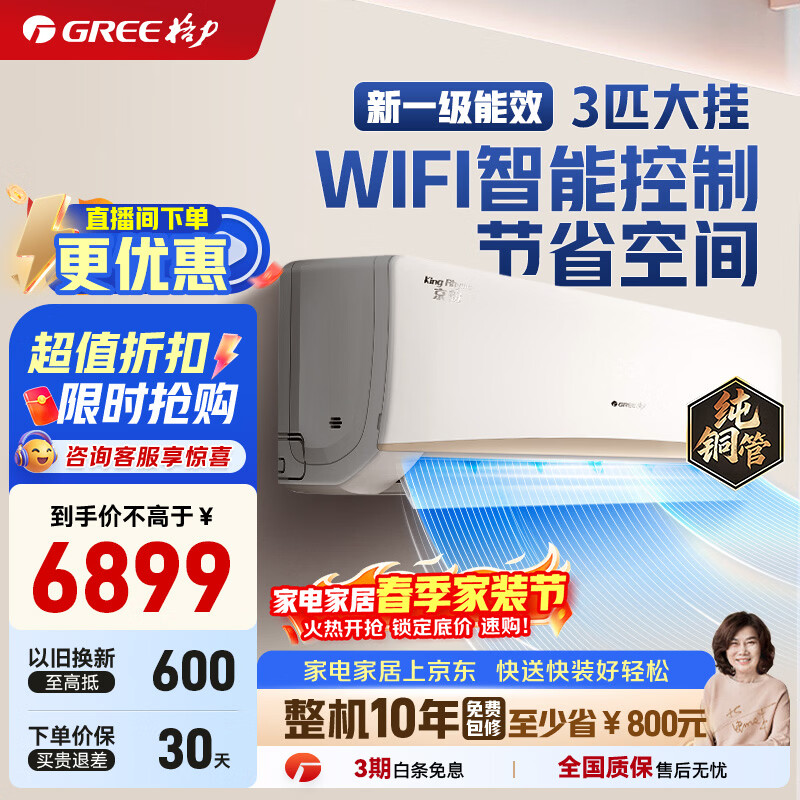 格力(GREE)空调京韵 新一级/三级能效变频冷暖 大风量 高温自洁 WIFI小客厅大卧室壁挂式大挂机 京韵 3匹 72GW/NhKe1BAj一级能效