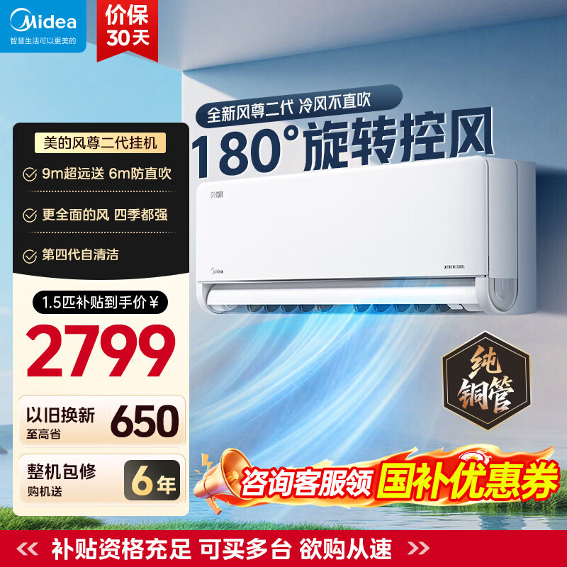 美的(Midea)空调 1.5匹风尊二代 新一代舒适空调 一级能效变频冷暖 壁挂式挂机智能家电云朵系列 国家补贴 1.5匹 一级能效风尊二代 全国联保 配送