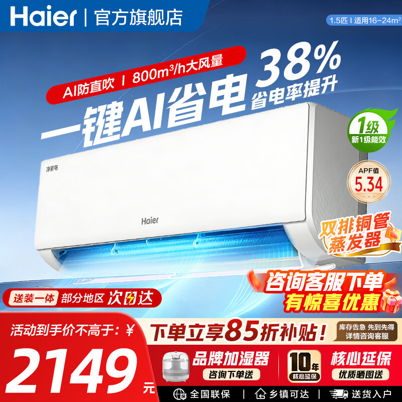 海尔空调净省电PLUS 1.5匹新一级变频挂机双排铜管大风量防直吹自清洁家用冷暖自动除湿 小红花套系 1.5匹 一级能效 净省电+智能防直吹+AI超节能